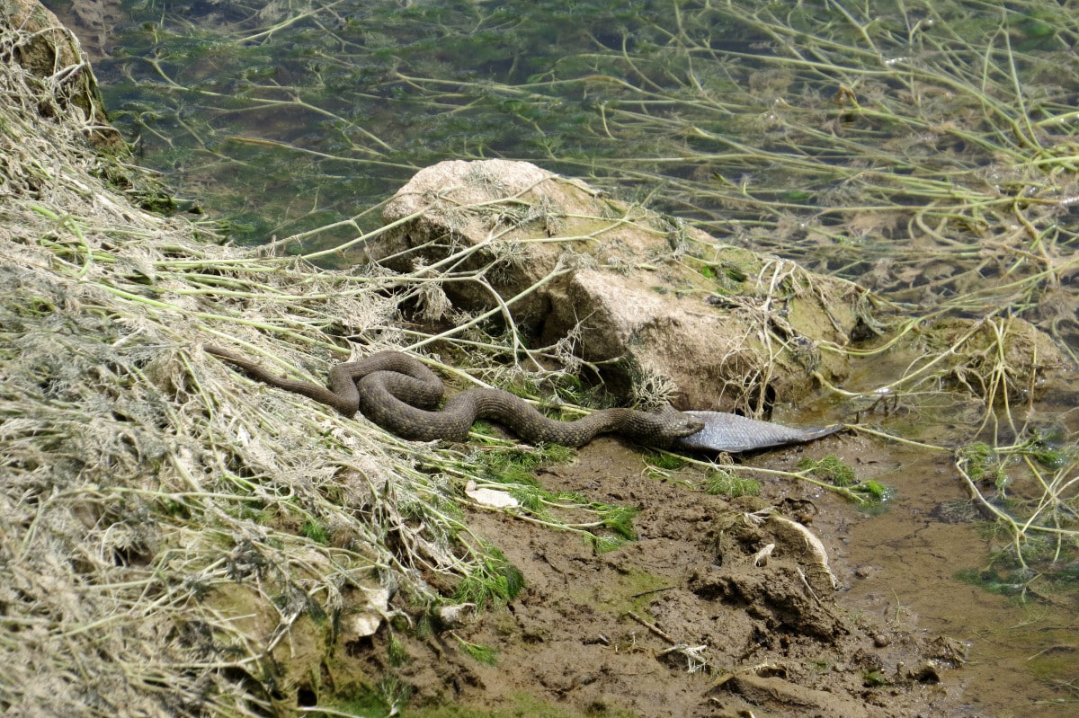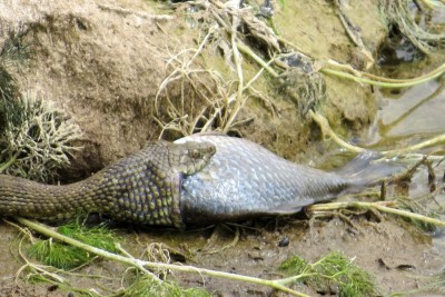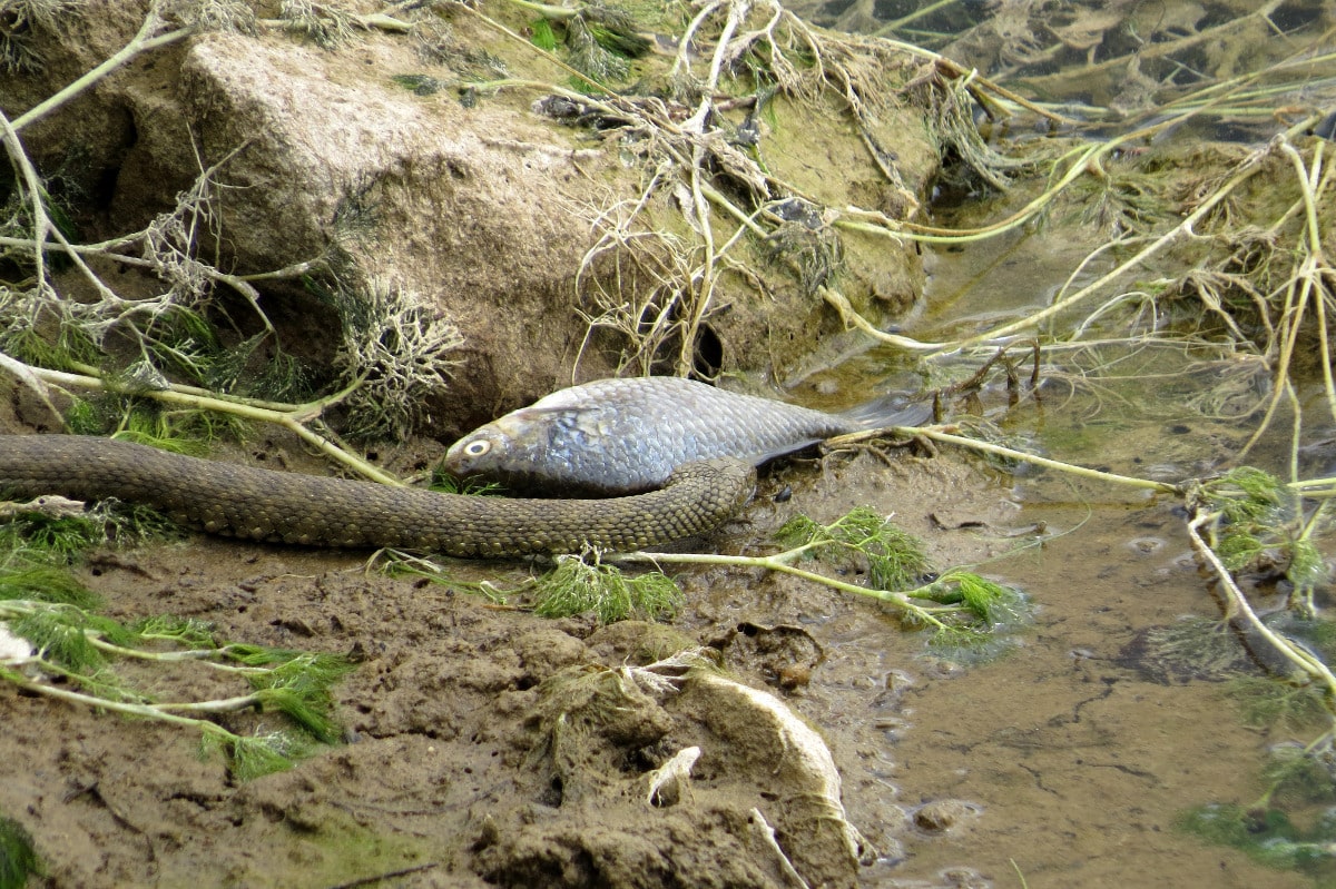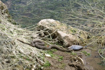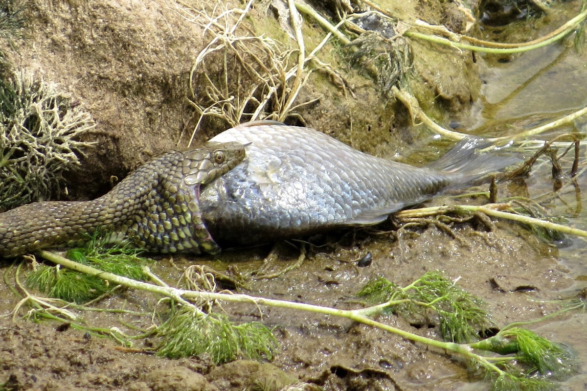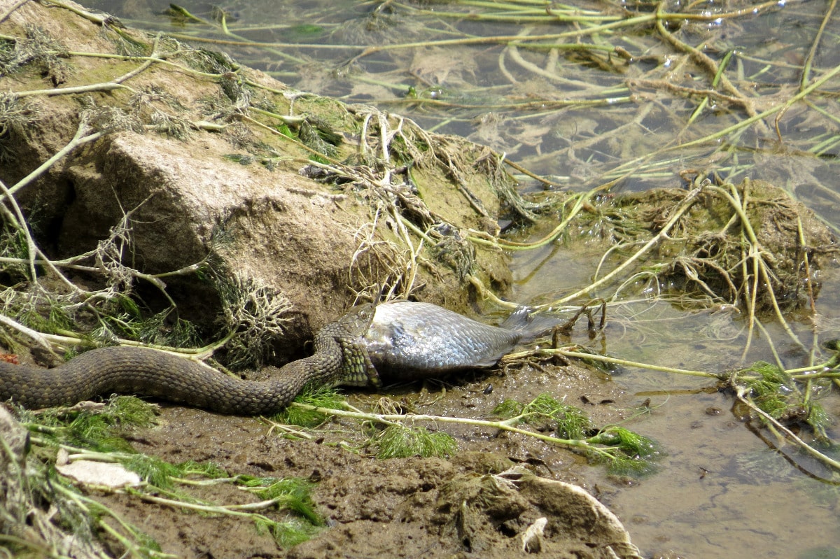 Наиме, змија рибарица је на обалу језера извукла бабушку "килаша" (ако мало претерујемо, Боже мој, па риболовци смо!) и покушала/покушавала да га прогута! Збиља, беше то крупан залогај! Присутвовали смо три (безуспешна) покушаја да га прогута! Загризла би, односно "разјапила" чељусти, дуго покушавала да га "навуче", те потом одустала! Па, пошто би "прикупила снагу", опет! И опет!