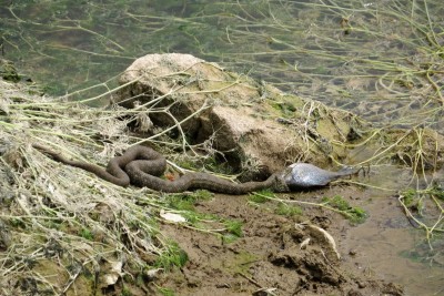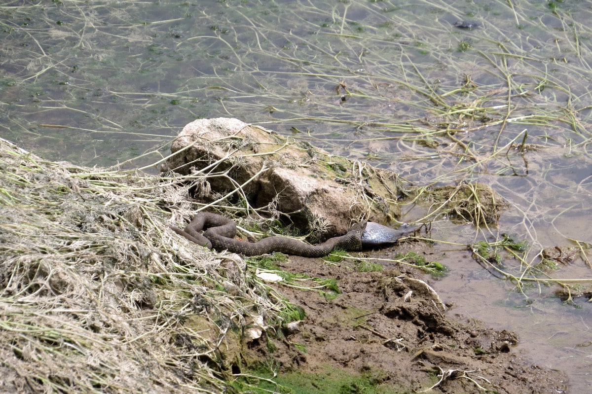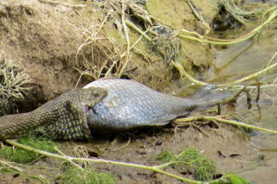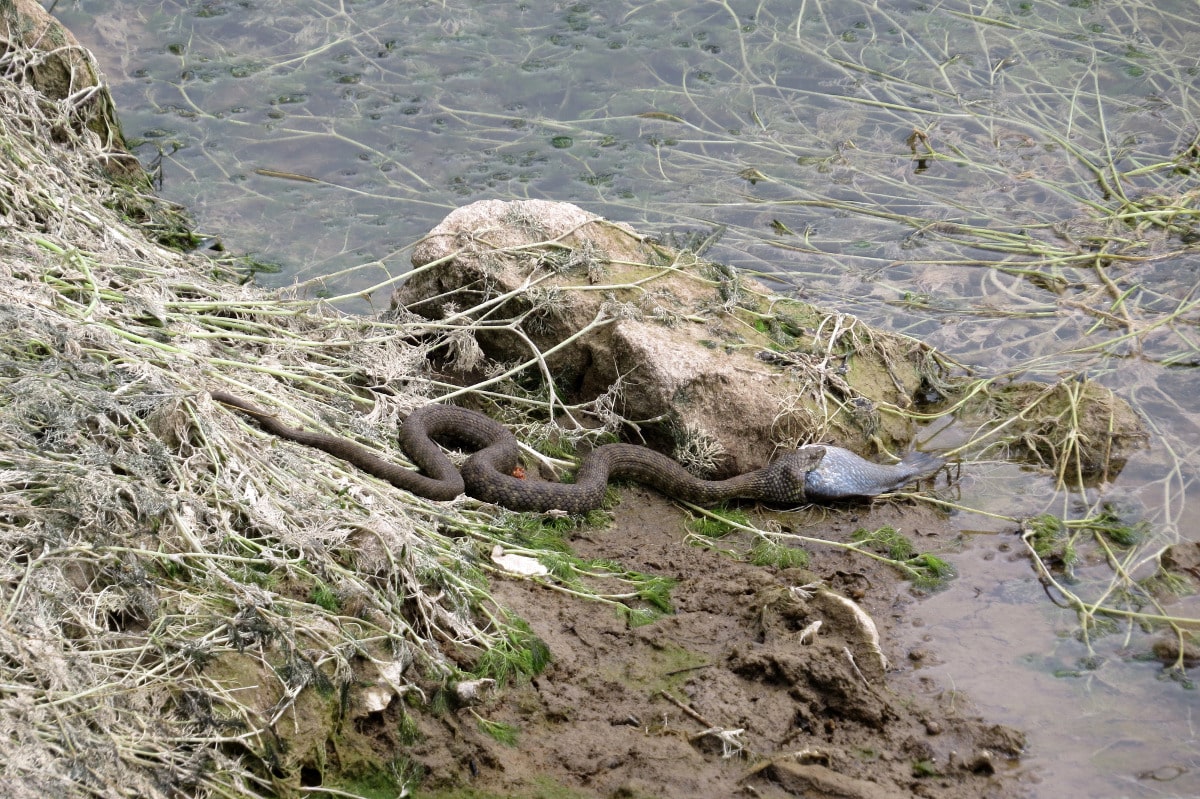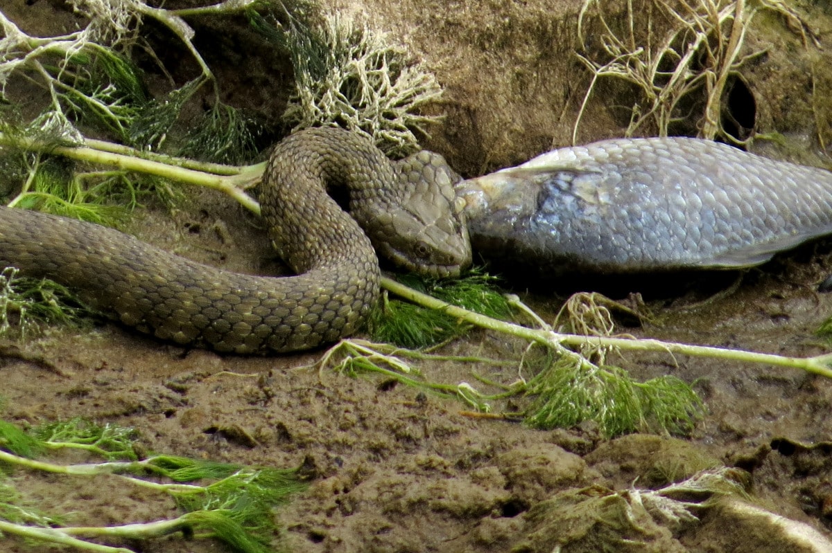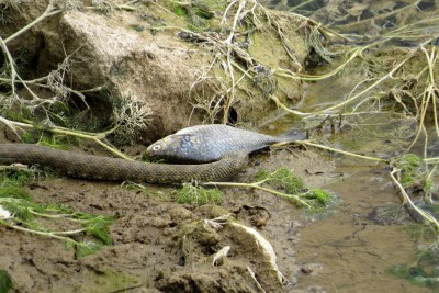 Наиме, змија рибарица је на обалу језера извукла бабушку "килаша" (ако мало претерујемо, Боже мој, па риболовци смо!) и покушала/покушавала да га прогута! Збиља, беше то крупан залогај! Присутвовали смо три (безуспешна) покушаја да га прогута! Загризла би, односно "разјапила" чељусти, дуго покушавала да га "навуче", те потом одустала! Па, пошто би "прикупила снагу", опет! И опет!